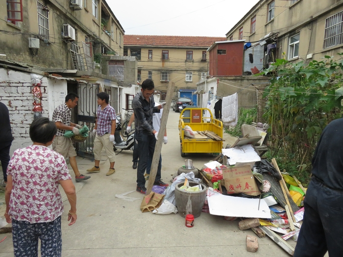 活動(dòng)中,志愿者們頂著酷暑對(duì)延安村小區(qū)道路垃圾、雜草及違規(guī)堆載物進(jìn)行集中清理,并挨家挨戶對(duì)長(zhǎng)期堆放在樓道衛(wèi)生死角的生活垃圾和廢棄雜物進(jìn)行搬清。正值夏季高溫,樓道內(nèi)的生活廢棄物因長(zhǎng)期堆壓捂悶發(fā)生霉變,不時(shí)傳出刺鼻異味。志愿者們不怕苦、不嫌臟,與社區(qū)工人一起經(jīng)過(guò)3個(gè)小時(shí)奮戰(zhàn),完成了3條小區(qū)道路、7個(gè)樓棟單元的清理任務(wù),42戶小區(qū)居民的衛(wèi)生環(huán)境得到明顯改善。